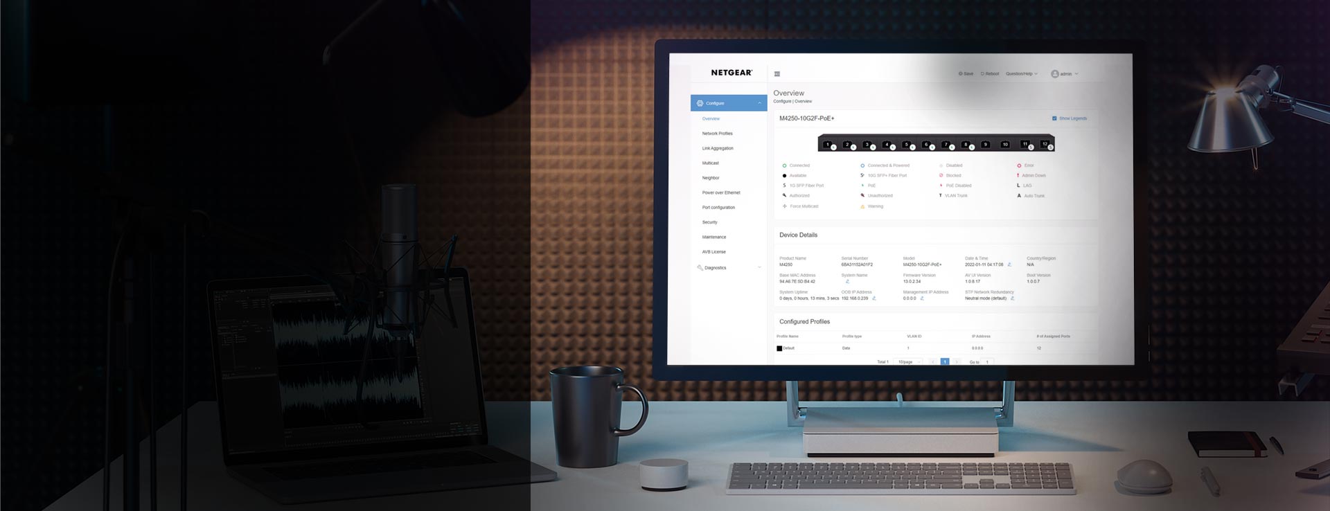 Number of Ports : 12 (12x 2.5G, 2x SFP+) PoE Ports / Budget : None IGMP Support : Enhanced (NETGEAR IGMP Plus™) Jumbo Frame Support : Yes, up to 12kb Acoustics : Fanless or 46.4dB@25ºC Power Consumption : System Full Load: 37.9W/129.39Btu/hr; Standby without any port connection: 14.1W/48.14Btu/hr AVB Support : Yes. Electronic license required, activation key sent via email (AVB4214X-10000S) Third party support : Domotz |